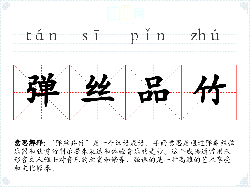 “弹丝品竹”是一个汉语成语,字面意思是通过弹奏丝弦乐器和欣赏竹制乐器来表达和体验音乐的美妙。这个成语通常用来形容文人雅士对音乐的欣赏和修养,强调的是一种高雅的艺术享受和文化修养。