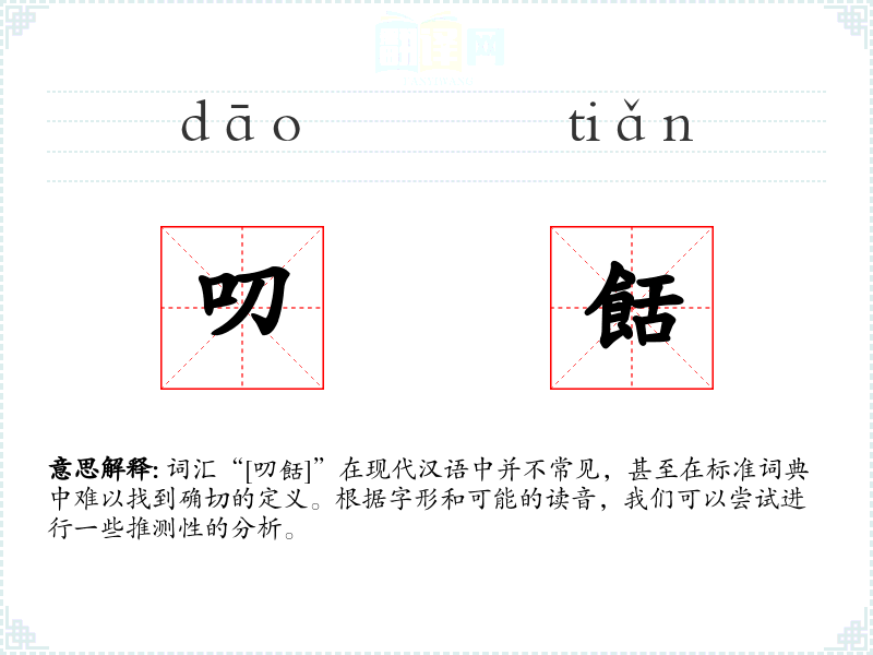 由于“[叨餂]”不是一个标准词汇,我们无法对其进行深入的理解和分析。在语言学习和表达中,遇到不明确的词汇时,最好的做法是查阅权威的词典或资料,以确保准确性和恰当性。