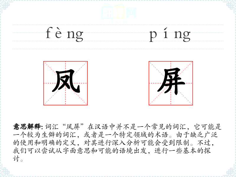 词汇“凤屏”在汉语中并不是一个常见的词汇,它可能是一个较为生僻的词汇,或者是一个特定领域的术语。由于缺乏广泛的使用和明确的定义,对其进行深入分析可能会受到限制。不过,我们可以尝试从字面意思和可能的语境出发,进行一些基本的探讨。