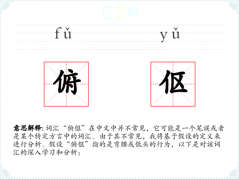 词汇“俯伛”在中文中并不常见,它可能是一个笔误或者是某个特定方言中的词汇。由于其不常见,我将基于假设的定义来进行分析。假设“俯伛”指的是弯腰或低头的行为,以下是对该词汇的深入学习和分析: