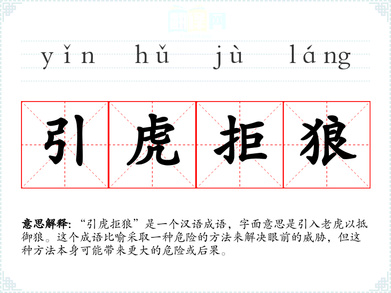 “引虎拒狼”是一个汉语成语,字面意思是引入**以抵御狼。这个成语比喻采取一种危险的方法来解决眼前的威胁,但这种方法本身可能带来更大的危险或后果。
