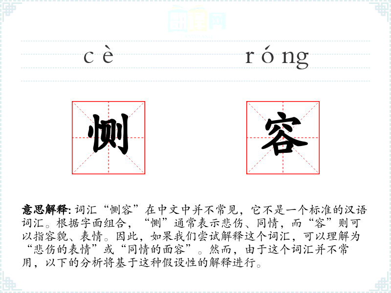 词汇“恻容”在中文中并不常见,它不是一个标准的汉语词汇。根据字面组合,“恻”通常表示悲伤、同情,而“容”则可以指容貌、表情。因此,如果我们尝试解释这个词汇,可以理解为“悲伤的表情”或“同情的面容”。然而,由于这个词汇并不常用,以下的分析将基于这种假设性的解释进行。