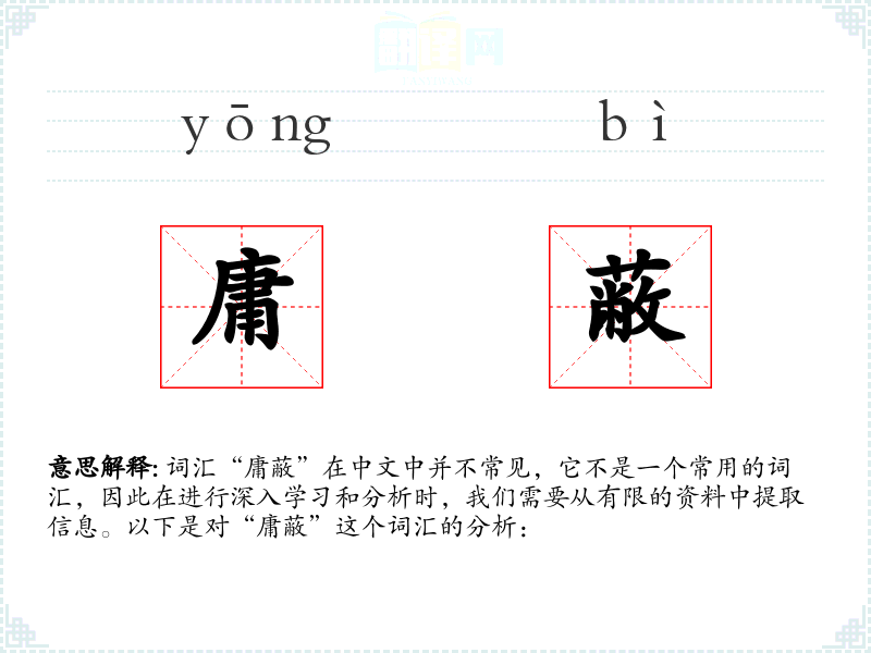 词汇“庸蔽”在中文中并不常见,它不是一个常用的词汇,因此在进行深入学习和分析时,我们需要从有限的资料中提取信息。以下是对“庸蔽”这个词汇的分析: