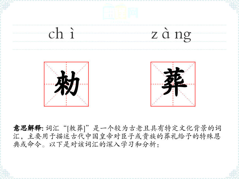 词汇“[敕葬]”是一个较为古老且具有特定文化背景的词汇,主要用于描述古代***对臣子或贵族的葬礼给予的特殊恩典或命令。以下是对该词汇的深入学和分析: