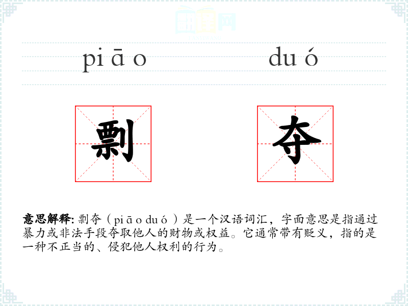 剽夺(piāo duó)是一个汉语词汇,字面意思是指通过暴力或非法手段夺取他人的财物或权益。它通常带有贬义,指的是一种不正当的、侵犯他人权利的行为。