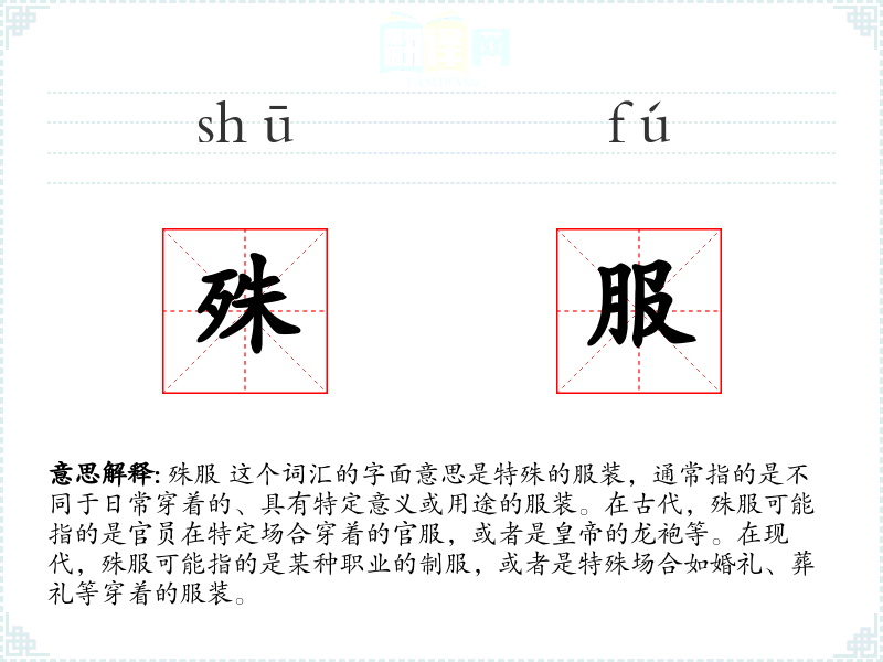 - 口语:在日常口语中,殊服可能指的是某人穿着的特别服装,比如“他今天穿了一件殊服,看起来很正式。”