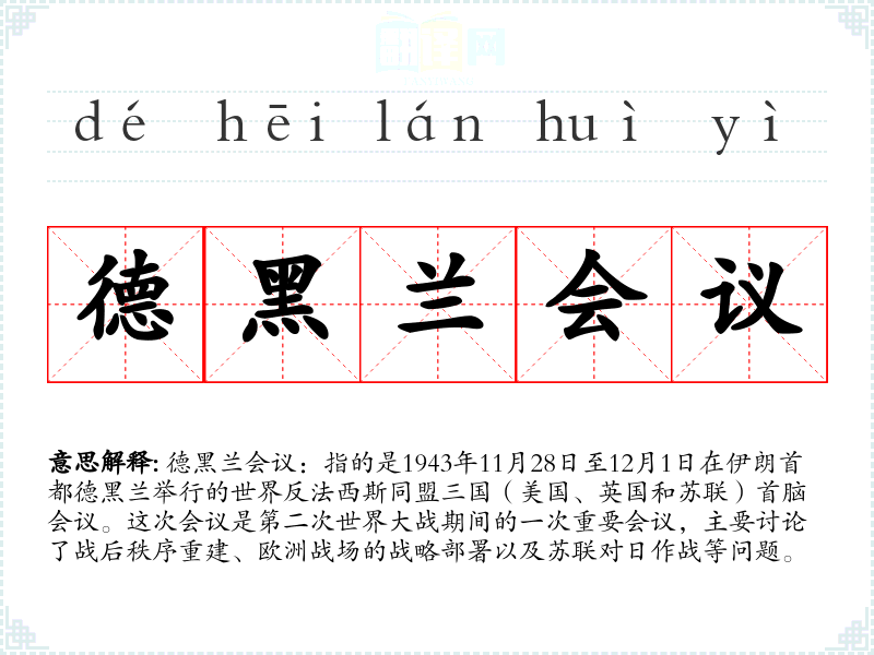 德黑兰会议在二战历史和国际关系史上占有重要地位,它不仅标志着同盟国在战略上的统一,也为战后的世界秩序奠定了基础。这个词因此与国际政治、战争历史紧密相关。