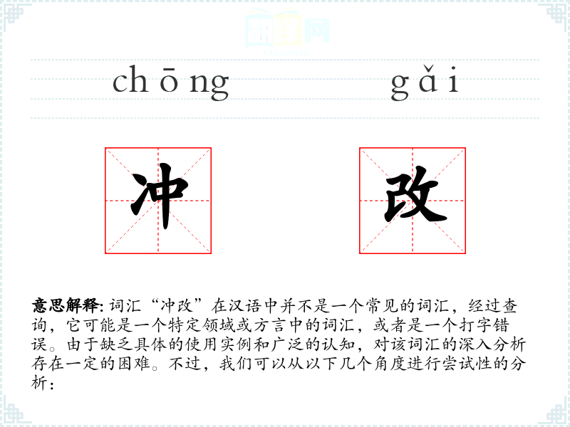 综上所述,词汇“冲改”可能是一个特定领域或方言中的词汇,或者是一个打字错误。在没有更多信息和使用实例的情况下,我们无法对其进行深入的分析和理解。