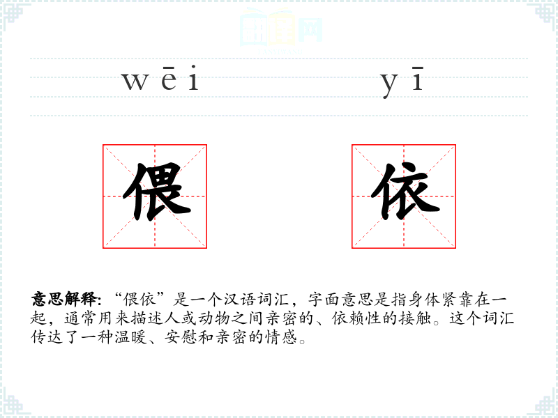 “偎依”是一个汉语词汇,字面意思是指身体紧靠在一起,通常用来描述人或动物之间亲密的、依赖性的接触。这个词汇传达了一种温暖、安慰和亲密的情感。