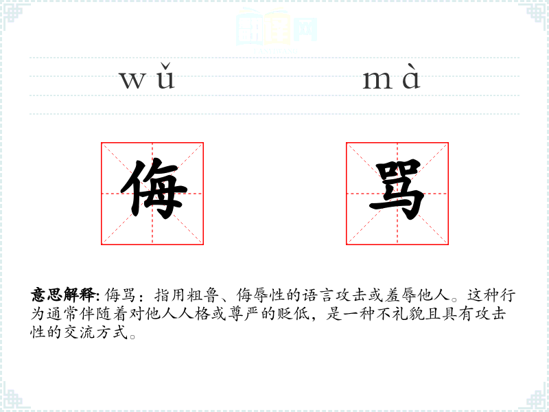 侮骂:指用粗鲁、侮辱性的语言攻击或羞辱他人。这种行为通常伴随着对他人人格或尊严的贬低,是一种不礼貌且具有攻击性的交流方式。