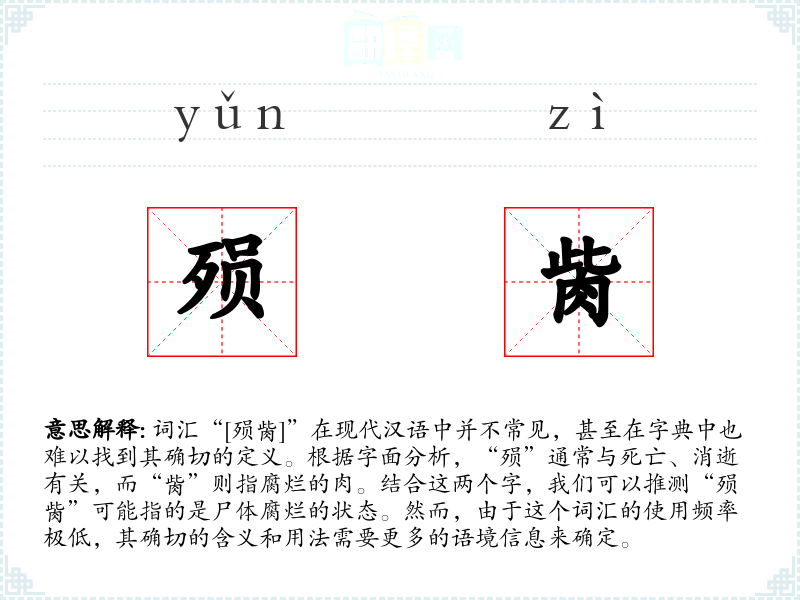 词汇“[殒胔]”在现代汉语中并不常见,甚至在字典中也难以找到其确切的定义。根据字面分析,“殒”通常与死亡、消逝有关,而“胔”则指腐烂的肉。结合这两个字,我们可以推测“殒胔”可能指的是尸体腐烂的状态。然而,由于这个词汇的使用频率极低,其确切的含义和用法需要更多的语境信息来确定。
