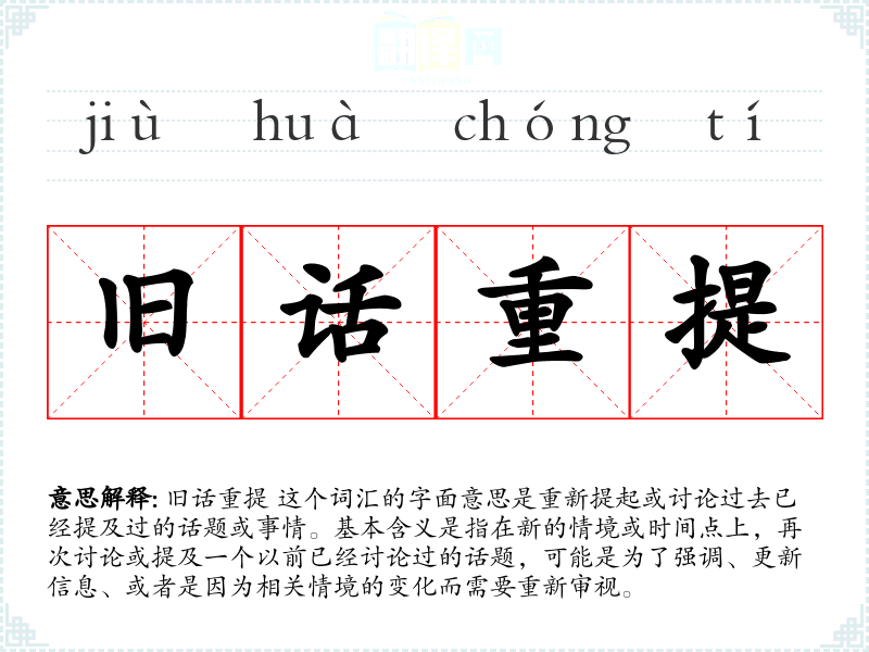 旧话重提 这个词汇的字面意思是重新提起或讨论过去已经提及过的话题或事情。基本含义是指在新的情境或时间点上,再次讨论或提及一个以前已经讨论过的话题,可能是为了强调、更新信息、或者是因为相关情境的变化而需要重新审视。