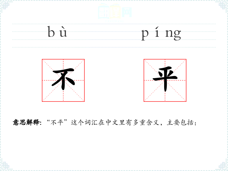 “不平”这个词汇在中文里有多重含义,主要包括: