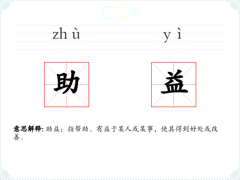 助益:指帮助、有益于某人或某事,使其得到好处或改善。