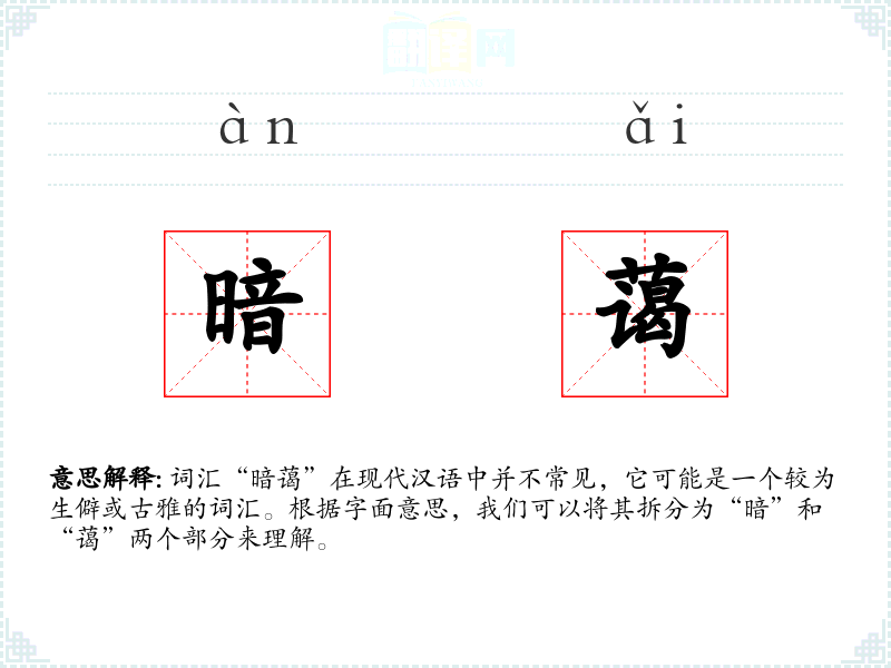 词汇“暗蔼”在现代汉语中并不常见,它可能是一个较为生僻或古雅的词汇。根据字面意思,我们可以将其拆分为“暗”和“蔼”两个部分来理解。