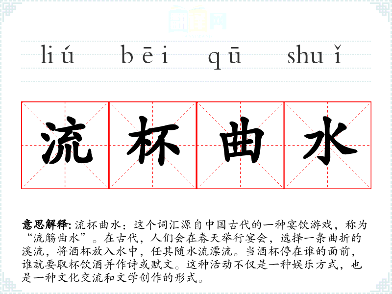 流杯曲水:这个词汇源自**古代的一种宴饮游戏,称为“流觞曲水”。在古代,人们会在春天举行宴会,选择一条曲折的溪流,将酒杯放入水中,任其随水流漂流。当酒杯停在谁的面前,谁就要取杯饮酒并作诗或赋文。这种活动不仅是一种娱乐方式,也是一种文化交流和文学创作的形式。