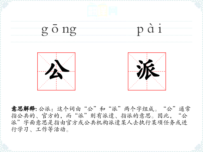 公派:这个词由“公”和“派”两个字组成。“公”通常指公共的、官方的,而“派”则有派遣、指派的意思。因此,“公派”字面意思是指由官方或公共机构派遣某人去执行某项任务或进行学*、工作等活动。