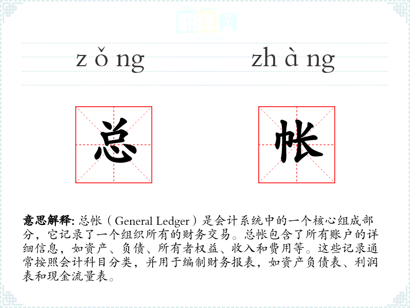 总帐(General Ledger)是会计系统中的一个核心组成部分,它记录了一个组织所有的财务交易。总帐包含了所有账户的详细信息,如资产、负债、所有者权益、收入和费用等。这些记录通常按照会计科目分类,并用于编制财务报表,如资产负债表、利润表和现金流量表。