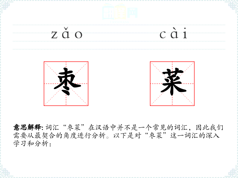 - 反义词:无(由于“枣菜”不是一个常用词汇,反义词不适用)