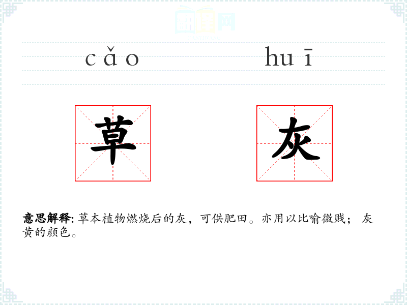 草本植物燃烧后的灰,可供肥田。亦用以比喻微贱; 灰黄的颜色。