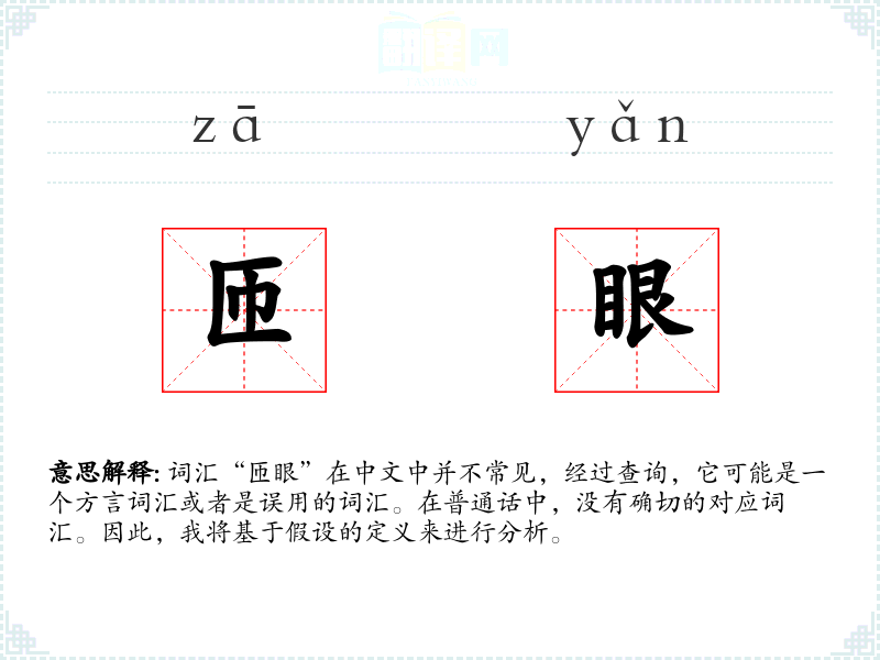 词汇“匝眼”在中文中并不常见,经过查询,它可能是一个方言词汇或者是误用的词汇。在普通话中,没有确切的对应词汇。因此,我将基于假设的定义来进行分析。