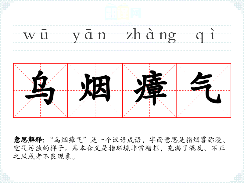 “乌烟瘴气”是一个汉语成语,字面意思是指烟雾弥漫、空气污浊的样子。基本含义是指环境非常糟糕,充满了混乱、不正之风或者不良现象。