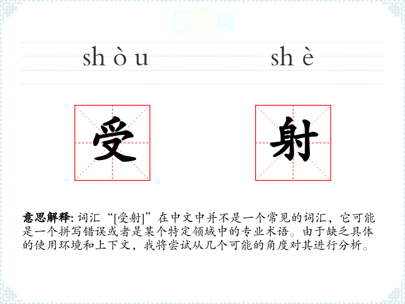 词汇“[受射]”在中文中并不是一个常见的词汇,它可能是一个拼写错误或者是某个特定领域中的专业术语。由于缺乏具体的使用环境和上下文,我将尝试从几个可能的角度对其进行分析。