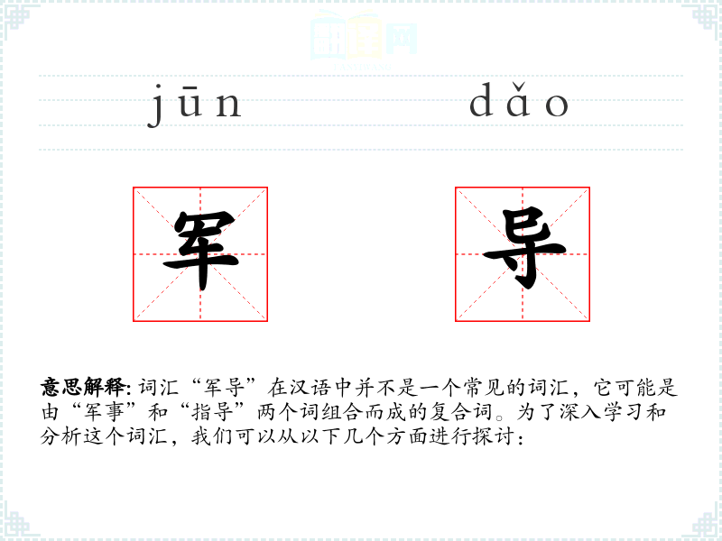 - 反义词:无(由于“军导”不是一个常用词汇,反义词可能不明显)