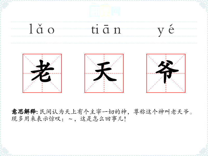 民间认为天上有个主宰一切的神,尊称这个神叫老天爷。现多用来表示惊叹:~,这是怎么回事儿!