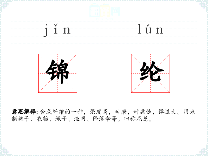 合成纤维的一种,强度高,耐磨,耐腐蚀,弹性大。用来制袜子、衣物、绳子、渔网、降落伞等。旧称尼龙。