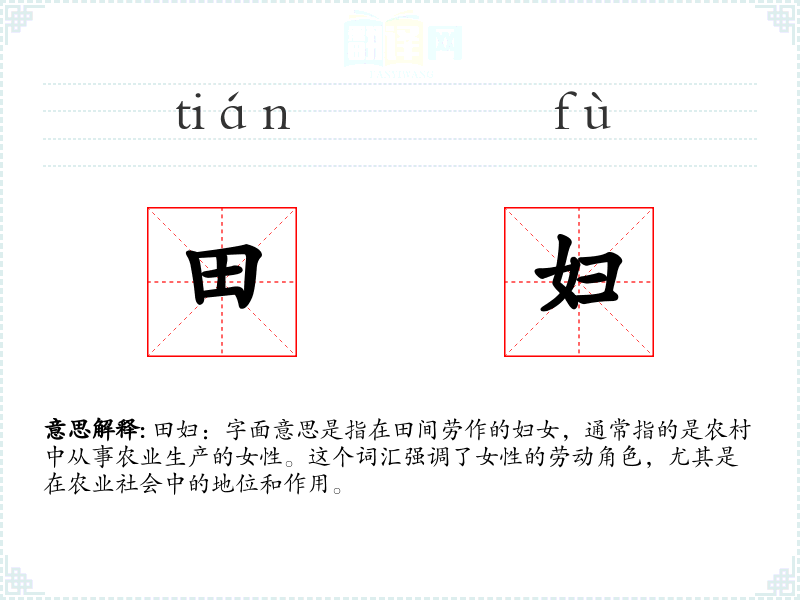 田妇:字面意思是指在田间劳作的妇女,通常指的是农村中从事农业生产的女性。这个词汇强调了女性的劳动角色,尤其是在农业社会中的地位和作用。