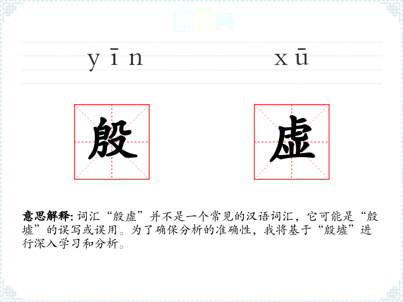 词汇“殷虚”并不是一个常见的汉语词汇,它可能是“殷墟”的误写或误用。为了确保分析的准确性,我将基于“殷墟”进行深入学*和分析。