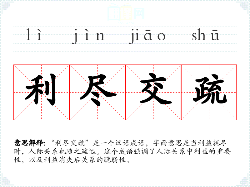 “利尽交疏”是一个汉语成语,字面意思是当利益耗尽时,人际关系也随之疏远。这个成语强调了人际关系中利益的重要性,以及利益消失后关系的脆弱性。