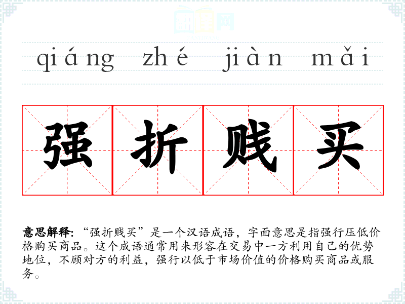 “强折贱买”是一个汉语成语,字面意思是指强行压低价格购买商品。这个成语通常用来形容在交易中一方利用自己的优势地位,不顾对方的利益,强行以低于市场价值的价格购买商品或服务。