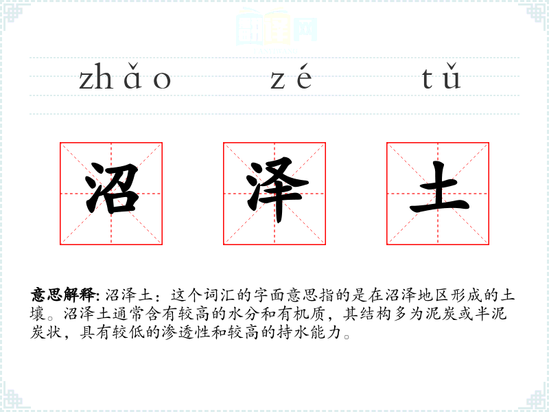- 词源:沼泽土一词源自汉语,其中“沼泽”指的是湿地,而“土”则是土壤的意思。