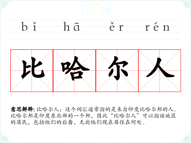 同义词:比哈尔邦居民、比哈尔裔 反义词:非比哈尔人(指非来自比哈尔邦的人)