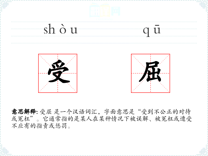 受屈 是一个汉语词汇,字面意思是“受到不公正的对待或冤枉”。它通常指的是某人在某种情况下被误解、被冤枉或遭受不应有的指责或惩罚。