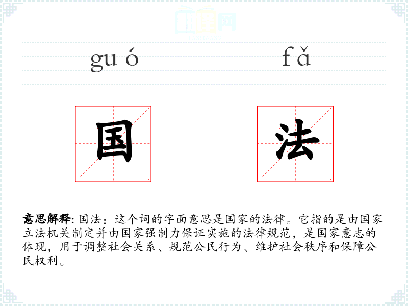 在不同语言中,“国法”可能有不同的表达,如英语中的“national law”或“state law”。这些词汇在各自文化中都承载着类似的权威和普遍性的含义。