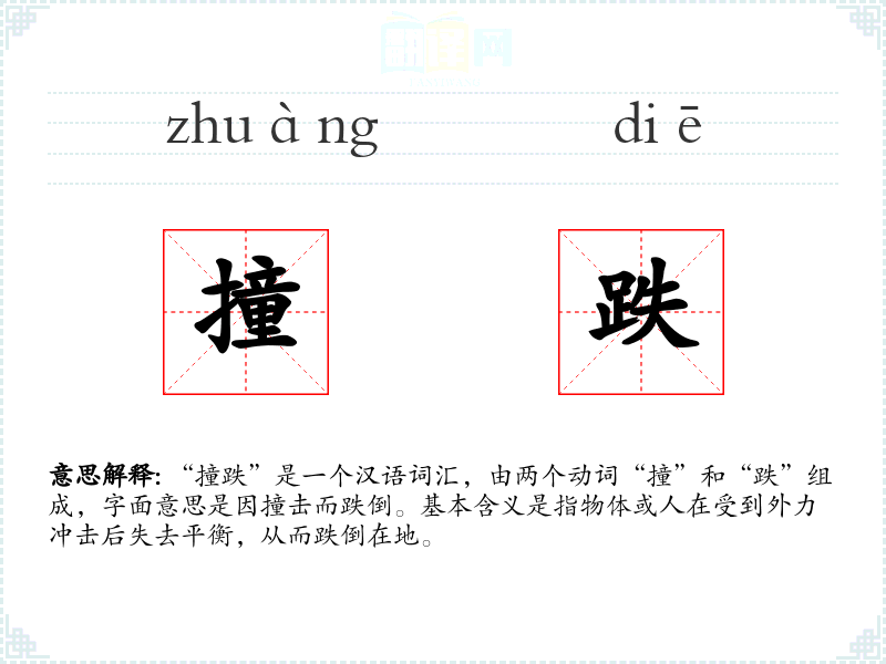 “撞跌”由两个古汉语词汇组成,“撞”源自“撞击”,“跌”源自“跌落”。在古代文献中,这两个词常分开使用,后来逐渐结合成一个词,用以描述因撞击导致的跌倒。