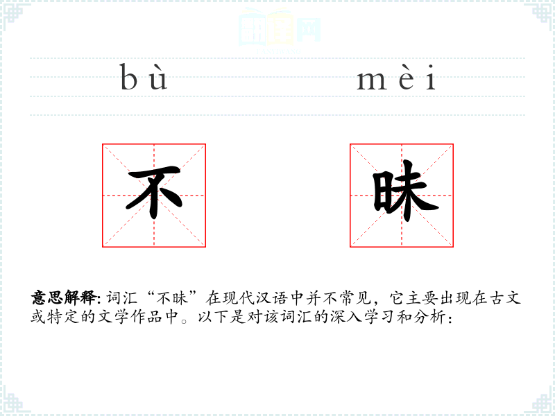 词汇“不昧”在现代汉语中并不常见,它主要出现在古文或特定的文学作品中。以下是对该词汇的深入学*和分析: