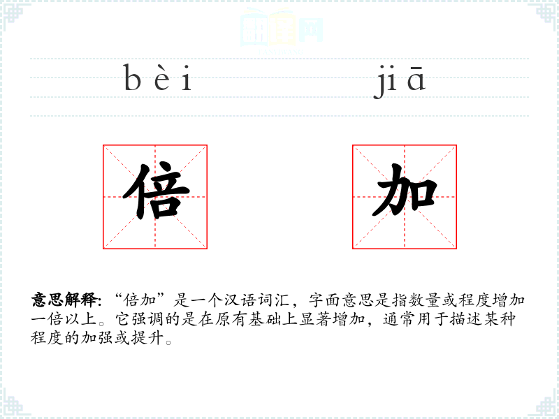 “倍加”源自汉语,其构成由“倍”和“加”两个字组成,分别表示“一倍”和“增加”。在古代文献中已有使用,如《左传》中有“倍加其赏”的记载。