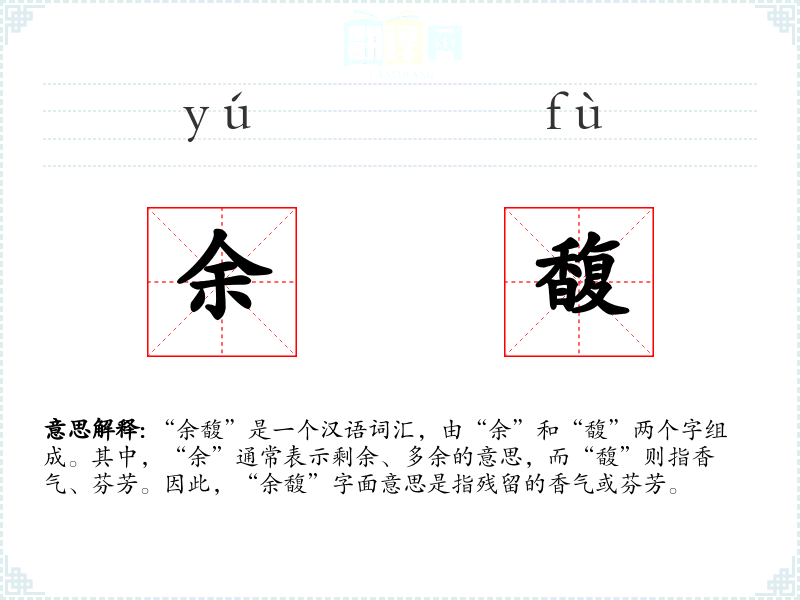 “余馥”是一个汉语词汇,由“余”和“馥”两个字组成。其中,“余”通常表示剩余、多余的意思,而“馥”则指香气、芬芳。因此,“余馥”字面意思是指残留的香气或芬芳。