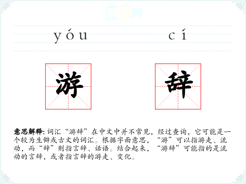 词汇“游辞”在中文中并不常见,经过查询,它可能是一个较为生僻或古文的词汇。根据字面意思,“游”可以指游走、流动,而“辞”则指言辞、话语。结合起来,“游辞”可能指的是流动的言辞,或者指言辞的游走、变化。