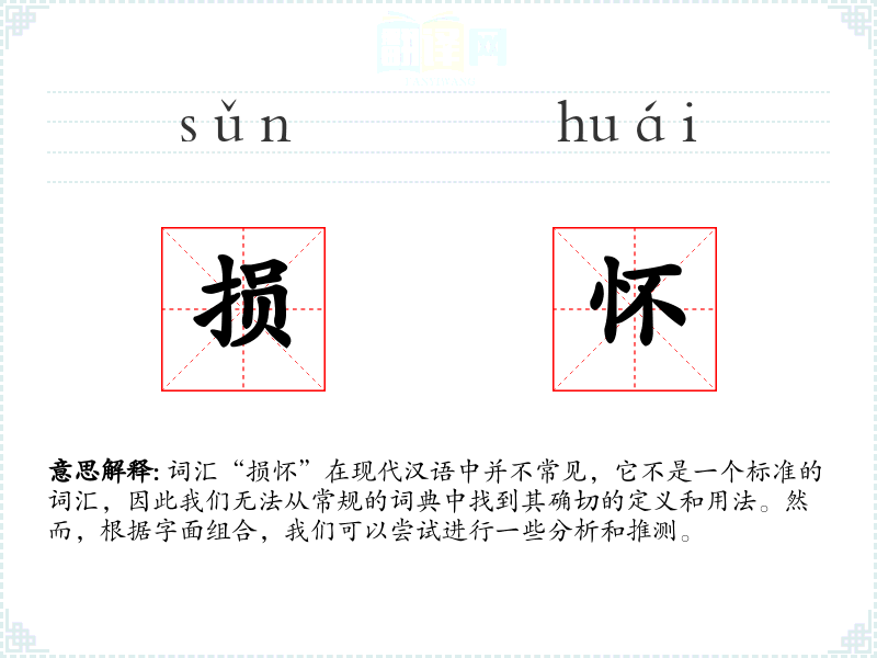 词汇“损怀”在现代汉语中并不常见,它不是一个标准的词汇,因此我们无法从常规的词典中找到其确切的定义和用法。然而,根据字面组合,我们可以尝试进行一些分析和推测。