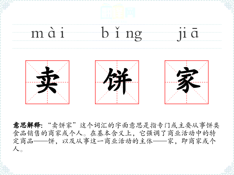 “卖饼家”这个词汇的字面意思是指专门或主要从事饼类食品销售的商家或个人。在基本含义上,它强调了商业活动中的特定商品——饼,以及从事这一商业活动的主体——家,即商家或个人。
