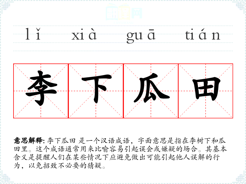 李下瓜田 是一个汉语成语,字面意思是指在李树下和瓜田里。这个成语通常用来比喻容易引起误会或嫌疑的场合。其基本含义是提醒人们在某些情况下应避免做出可能引起他人误解的行为,以免招致不必要的猜疑。
