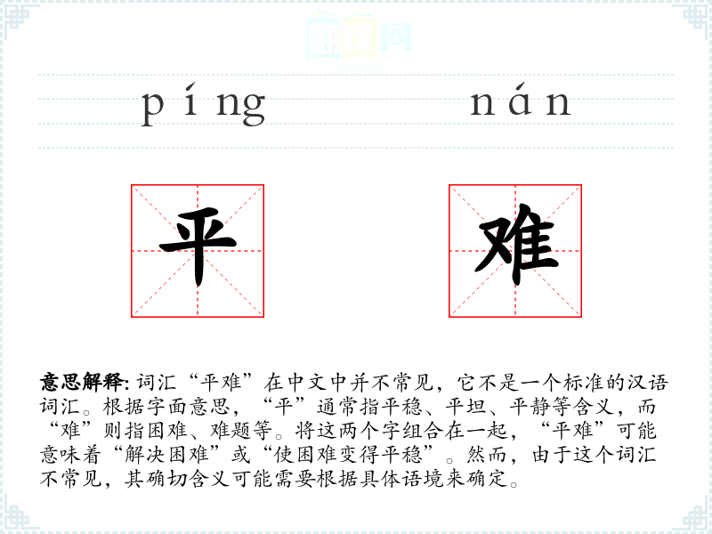 词汇“平难”在中文中并不常见,它不是一个标准的汉语词汇。根据字面意思,“平”通常指平稳、平坦、平静等含义,而“难”则指困难、难题等。将这两个字组合在一起,“平难”可能意味着“解决困难”或“使困难变得平稳”。然而,由于这个词汇不常见,其确切含义可能需要根据具体语境来确定。