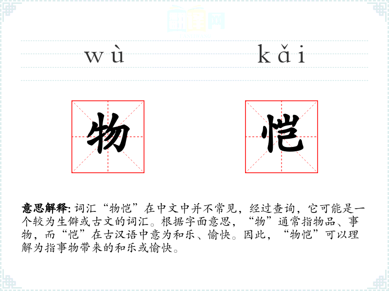 - 词源:“物”和“恺”都是古汉语词汇,组合起来形成了一个复合词。