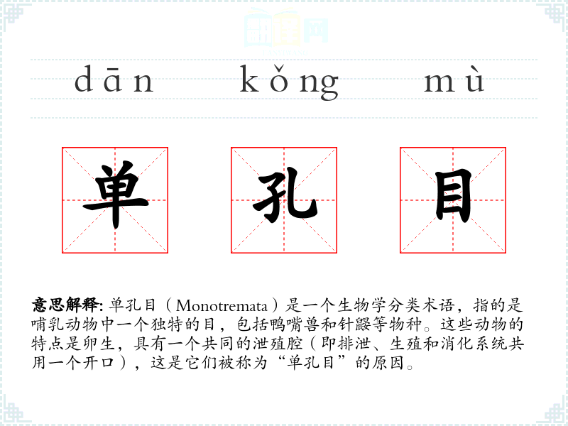 在不同语言中,“单孔目”可能直接翻译为类似的术语,如在西班牙语中为“Monotremata”,在法语中为“Monotrèmes”。这些翻译保留了原词的生物学意义。