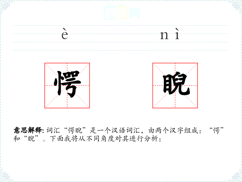 - 词源:“愕”和“睨”都是古代汉语词汇,历史悠久。
